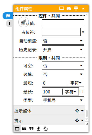 控件特有属性:默认值、占位符、自动聚焦、历史记录、可空、必填、最短、最长、类型。