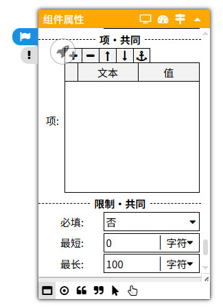 组合框控件的特有属性:项、必填、最短、最长。