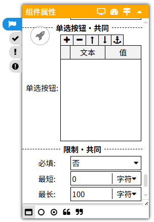 单选按钮组整体的特有属性:单选按钮、必填、最短、最长。