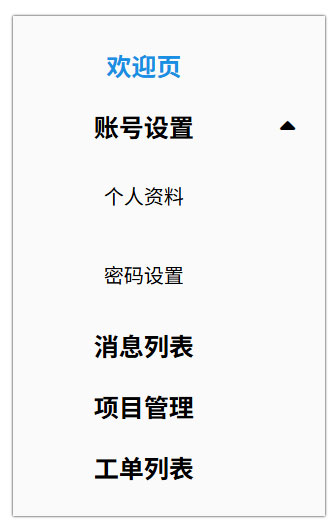 个人中心内目前主要有账号设置、消息列表、项目管理、工单列表。