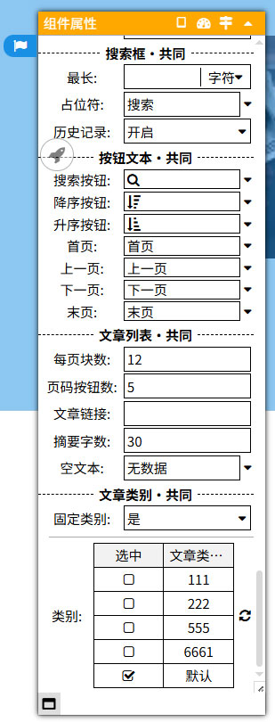 图片文章列表块的特有属性:最长、占位符、历史记录、搜索按钮、降序按钮、升序按钮、首页、上一页、下一页、末页、每页行数、页码按钮数、文章链接、摘要字数、空文本、固定类别、类别。