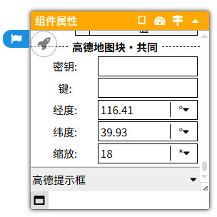 高德地图块的特有属性:密钥、键、经度、纬度、缩放。
