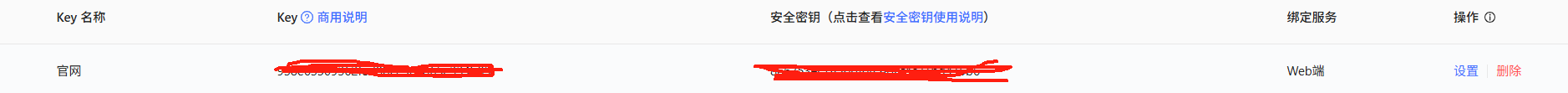 6、这时列表中有了刚刚添加的Key。分别复制它所在行的Key和安全密钥到小庄建站的高德地图块的对应属性中即可。